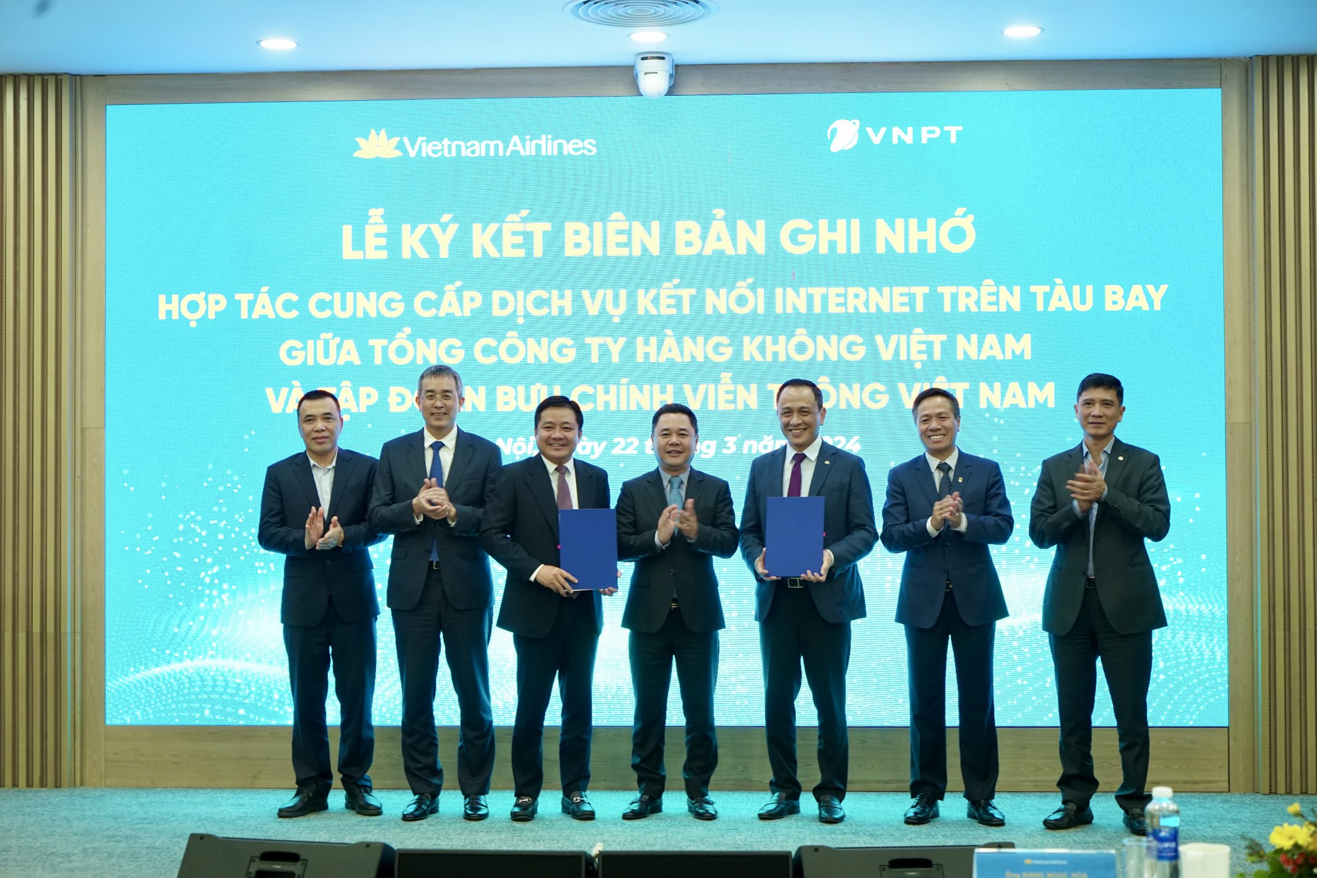 Lễ ký kết Biên bản ghi nhớ hợp tác có sự tham dự của Phó Chủ tịch UBQLVNN tại doanh nghiệp Nguyễn Ngọc Cảnh cùng tập thể lãnh đạo cấp cao của Vietnam Airlines và VNPT. Theo đó, Hãng hàng không Quốc gia dự kiến triển khai kết nối internet trên không cho một số máy bay của hãng trong năm 2025 trên các chặng bay quốc tế đi Mỹ, châu Âu và một số chặng bay nội địa. Các máy bay, chặng bay còn lại tiếp tục được triển khai từ năm 2026.