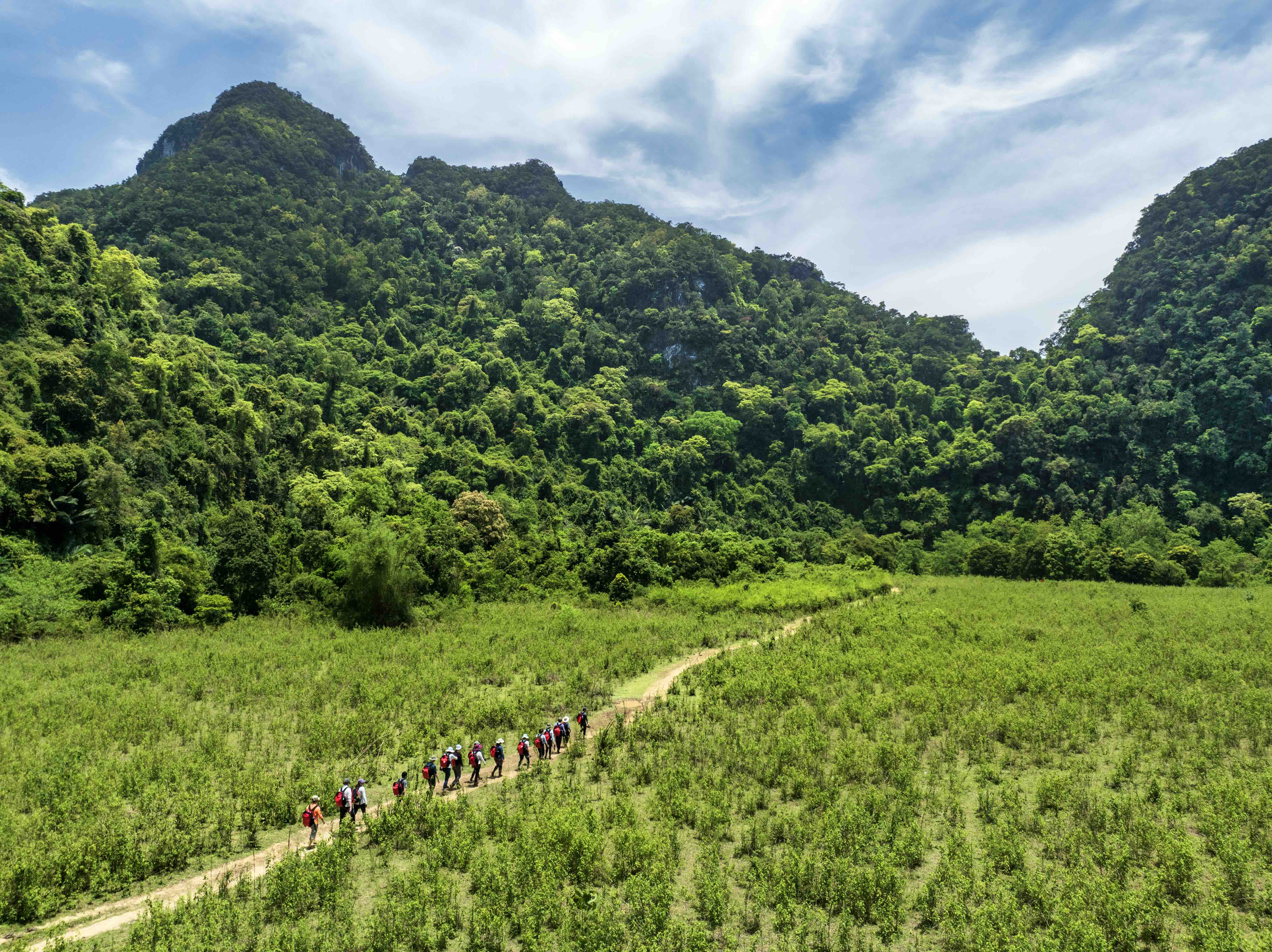 Cuộc phiêu lưu bắt đầu từ thôn Cổ Liêm, nơi con đường bê tông uốn lượn giữa cánh đồng xanh mướt dẫn du khách vào thung lũng Tú Làn. Không khí trong lành, tiếng chim hót líu lo và màu xanh mướt mát của ruộng đồng như một khúc dạo đầu êm ái trước khi bước vào chuyến phiêu lưu kỳ thú. Từ khu lưu trú Tú Làn Lodge, một công trình thích ứng với đặc điểm vùng rốn lũ, du khách được trang bị kỹ lưỡng cho hành trình khám phá: chỉ mang theo những đồ cần thiết, còn các porter bản địa sẽ hỗ trợ vận chuyển những túi vật dụng khác.