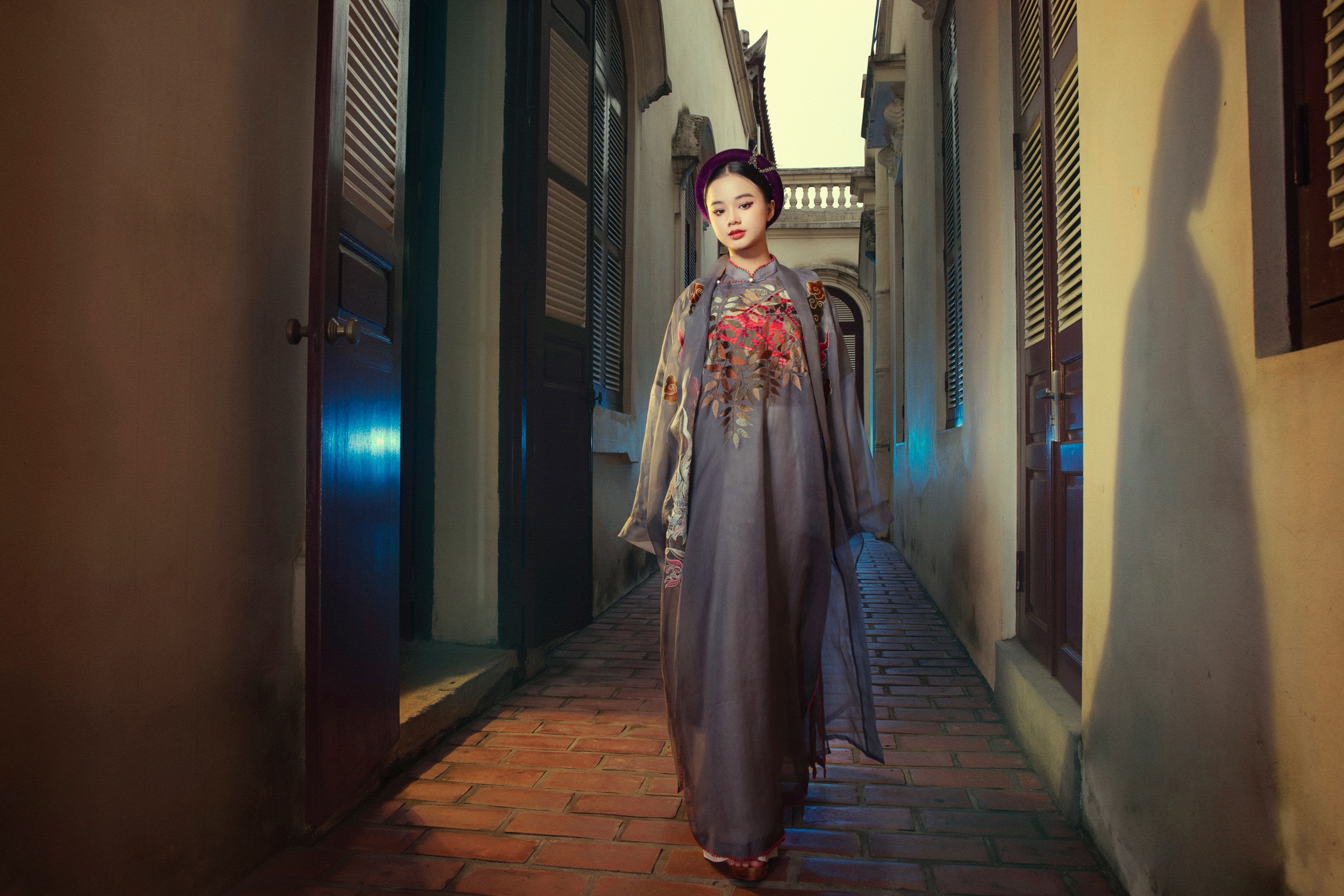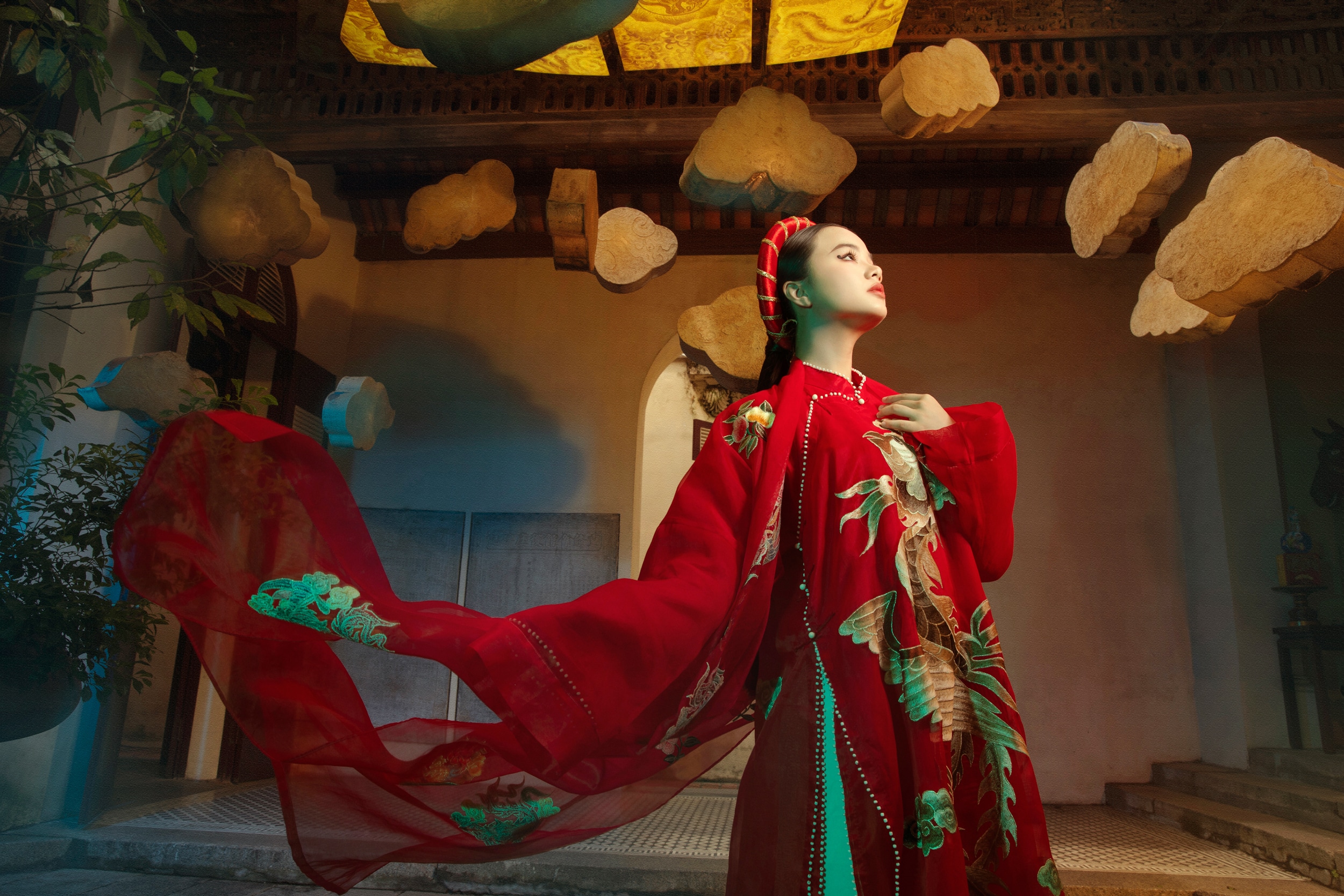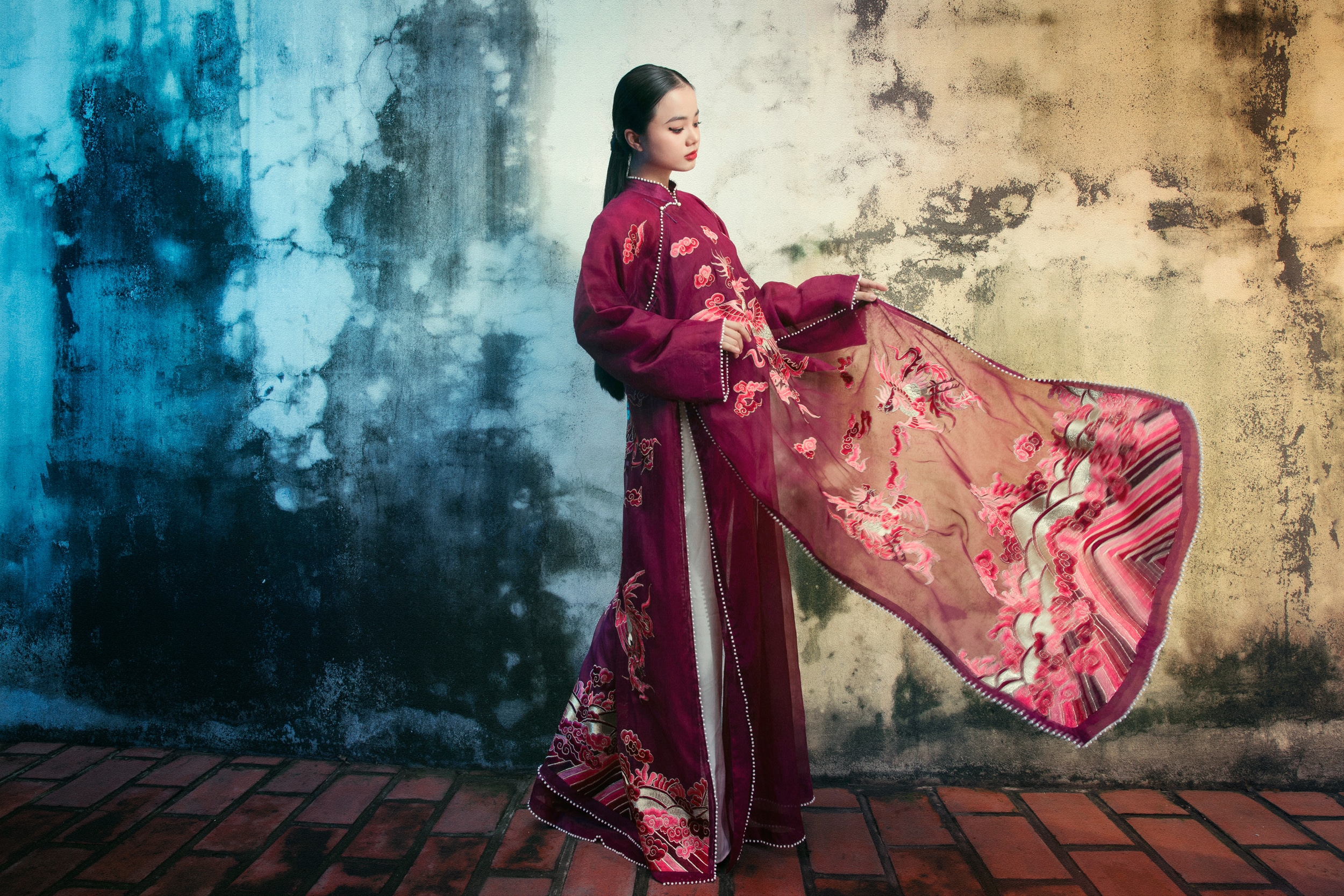 Nhà thiết kế và đội ngũ nghệ nhân lão luyện của làng nghề truyền thống Bắc Bộ đã dành nhiều tháng để thêu tay, giúp hoa văn có bề mặt mềm mịn, chuyển màu nhuần nhuyễn dưới ánh sáng. Đi kèm áo dài là những chiếc khăn tơ tằm khổ lớn thêu chim phụng và mấn nhung.