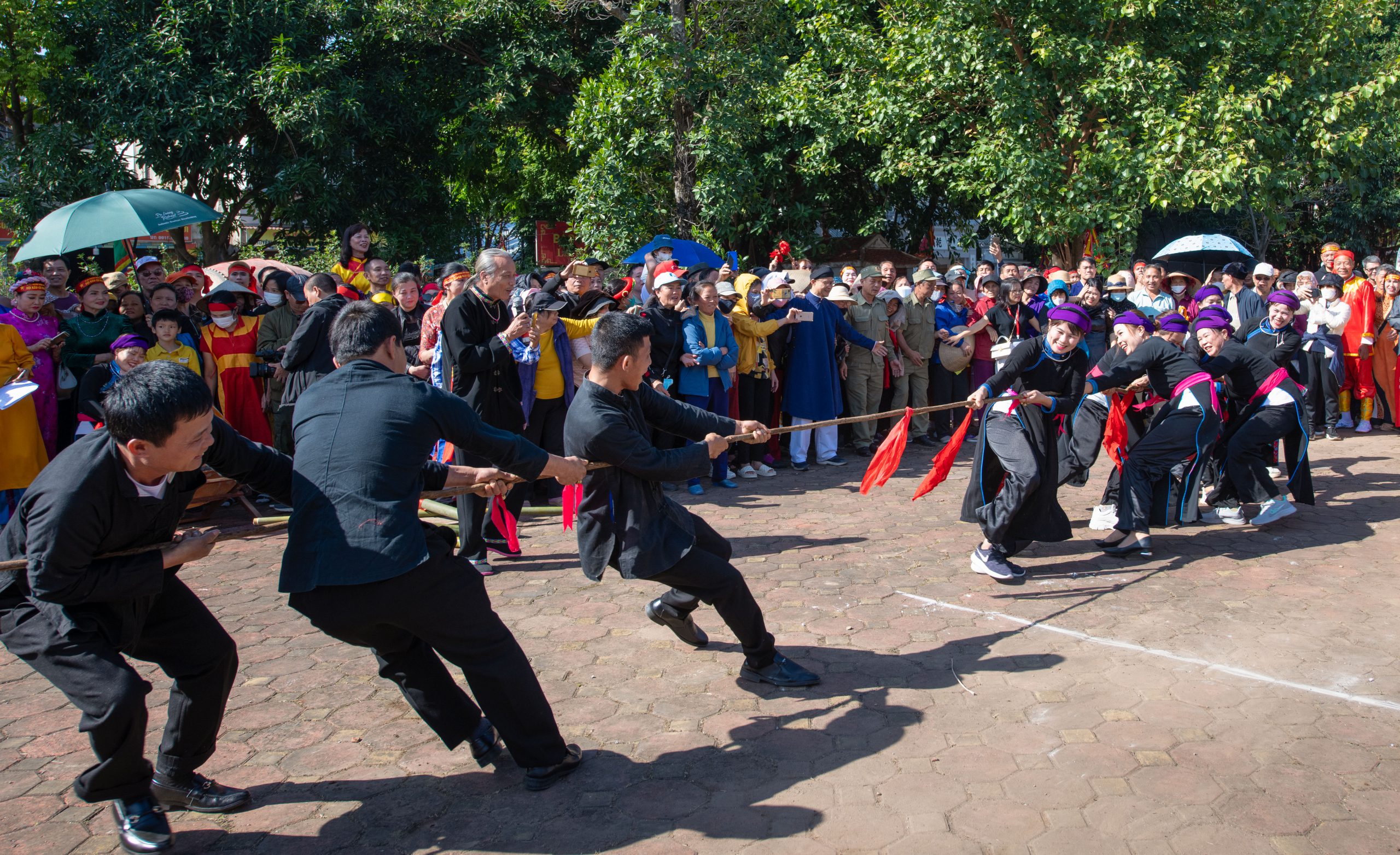 Làng Hữu Chấp ở xã Hòa Long – thành phố Bắc Ninh – là nơi thường xuyên tổ chức kéo co vào dịp Tết. Tham gia thi kéo co là các trai đinh được chia làm 2 phe: phe đông và phe tây. Thường mỗi bên có 37 trai đinh khỏe mạnh, đạo đức tốt, gia đình không có tang trong năm qua. Tất cả vận động viên thi đấu đều cởi trần, đóng khố, thắt lưng nhiễu điều, đầu chít khăn lụa. Hai đội bám tay chắc vào thân tre trong tư thế sẵn sàng chờ hiệu lệnh để kéo 3 keo phân thắng bại. Theo quan niệm của dân làng, phía đông là hướng của mặt trời mọc và phía tây là mặt trời lặn, vì thế kéo đến keo thứ 3 dân làng sẽ giúp sức để phe đông chiến thắng. Với niềm tin mặt trời mọc mang đến nắng ấm cho muôn loài nên người dân nơi đây cho rằng phe đông thắng cuộc thì mùa lúa sẽ bội thu, xóm làng bình yên, cư dân hòa thuận.