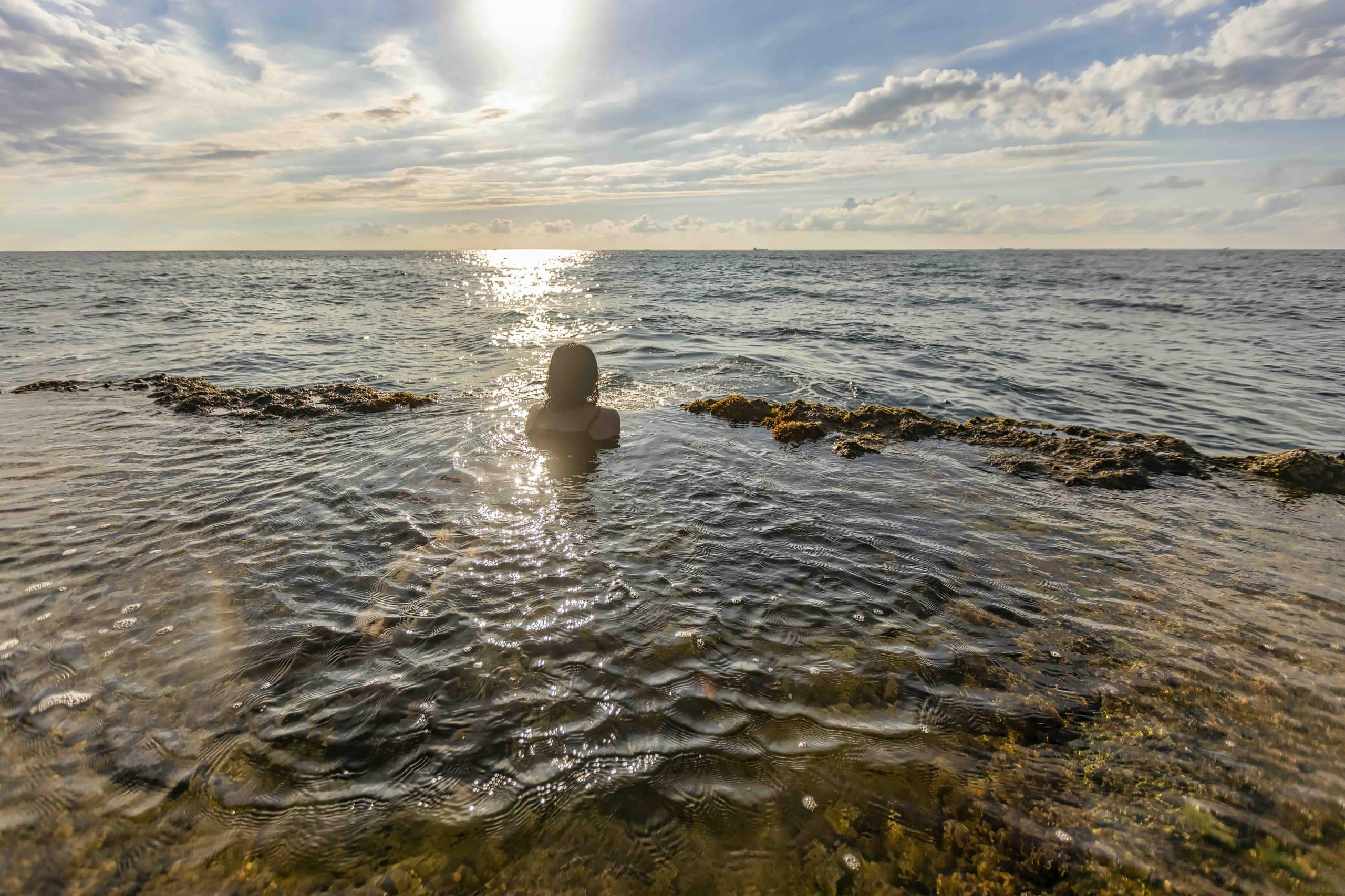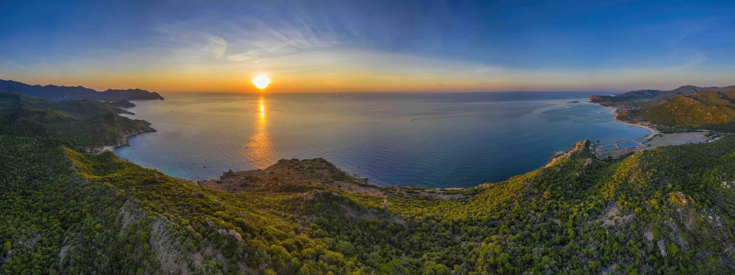 Chúng tôi dậy từ rất sớm nhen lửa đun nước pha cafe, ngồi đợi mặt trời. Vầng thái dương đang còn “lặn” dưới biển, dương quang của nó đã hắt lên vàng rực ở chân trời đằng đông, dần phân chia lại ranh giới giữa trời và biển – vốn đã bị xóa nhòa vào đêm hôm trước. Tạo hóa diệu kỳ khiến cho các mảng màu của thiên nhiên trong thời khắc bình minh biến đổi theo từng giây phút, khiến chúng tôi ngắm không chớp mắt, ly cafe nguội ngắt từ lúc nào không hay. Và rồi quả cam vàng rực từ từ nhô lên ở đường chân trời, hắt lên không trung một dải sáng chói lòa rực rỡ hình chữ V với 2 bên cánh hồng rực, mờ dần lẫn vào nền trời xa đang hửng lên mở ra ngày mới. Ngắm mặt trời trồi lên khỏi mặt biển, tôi phóng mắt nhìn khắp không gian xung quanh và lại sững sờ với vẻ đẹp mê ly. Mặt biển phản chiếu bầu trời, tạo thành hai mặt phẳng xanh thẳm, giao nhau tại đường chân trời vàng rực, thẳng tắp. Vài vầng mây trắng mỏng trên trời cùng mấy dải sóng gợn nhẹ trên mặt biển càng điểm xuyết cho bức tranh trước mắt trở nên hoàn hảo. Và nữa, ánh ban mai vàng ươm như mật tưới đẫm xuống những cánh rừng trên sườn núi Chúa, khiến tán lá rừng xanh biếc trở nên lấp lánh như những ánh mắt cười đón chào ngày mới. Những bãi cát mịn cong cong hình vòng cung với hai bên vách núi sáng tối tương phản, giống như thiếu nữ xinh đẹp xõa tóc e ấp che bớt một phần gương mặt.