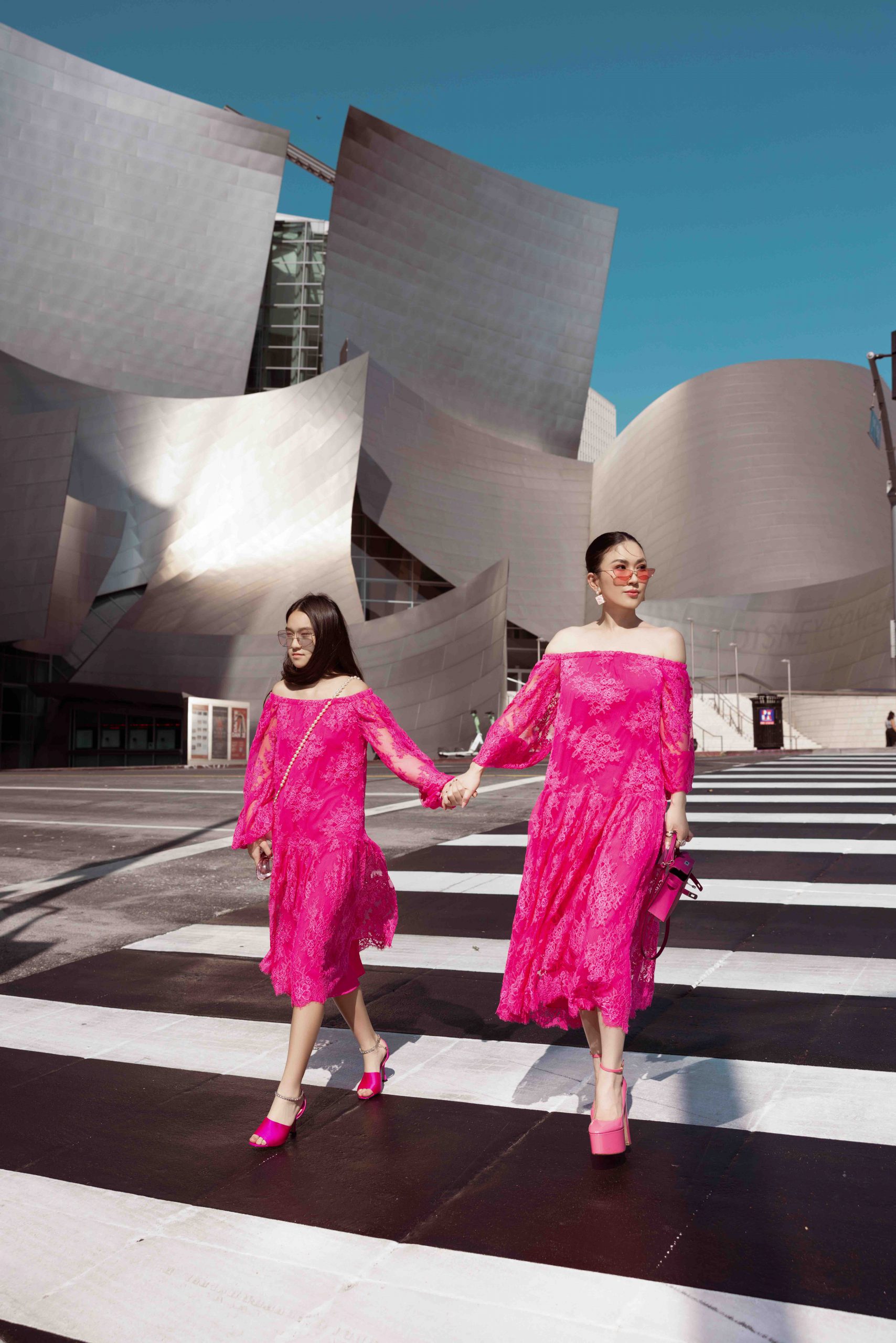 Cùng là chất liệu ren trên sắc đỏ tươi, nàng fashionista diện set đồ trẻ trung, sành điệu khi phối cùng đôi cao gót platform cùng tông, trong khi cô con gái nhỏ chọn phong cách cyber girl với boots cao cổ. Với cùng thiết kế đầm off shoulder hồng neon trẻ trung, cả hai trông như hai chị em sinh đôi đang dạo phố rực rỡ.