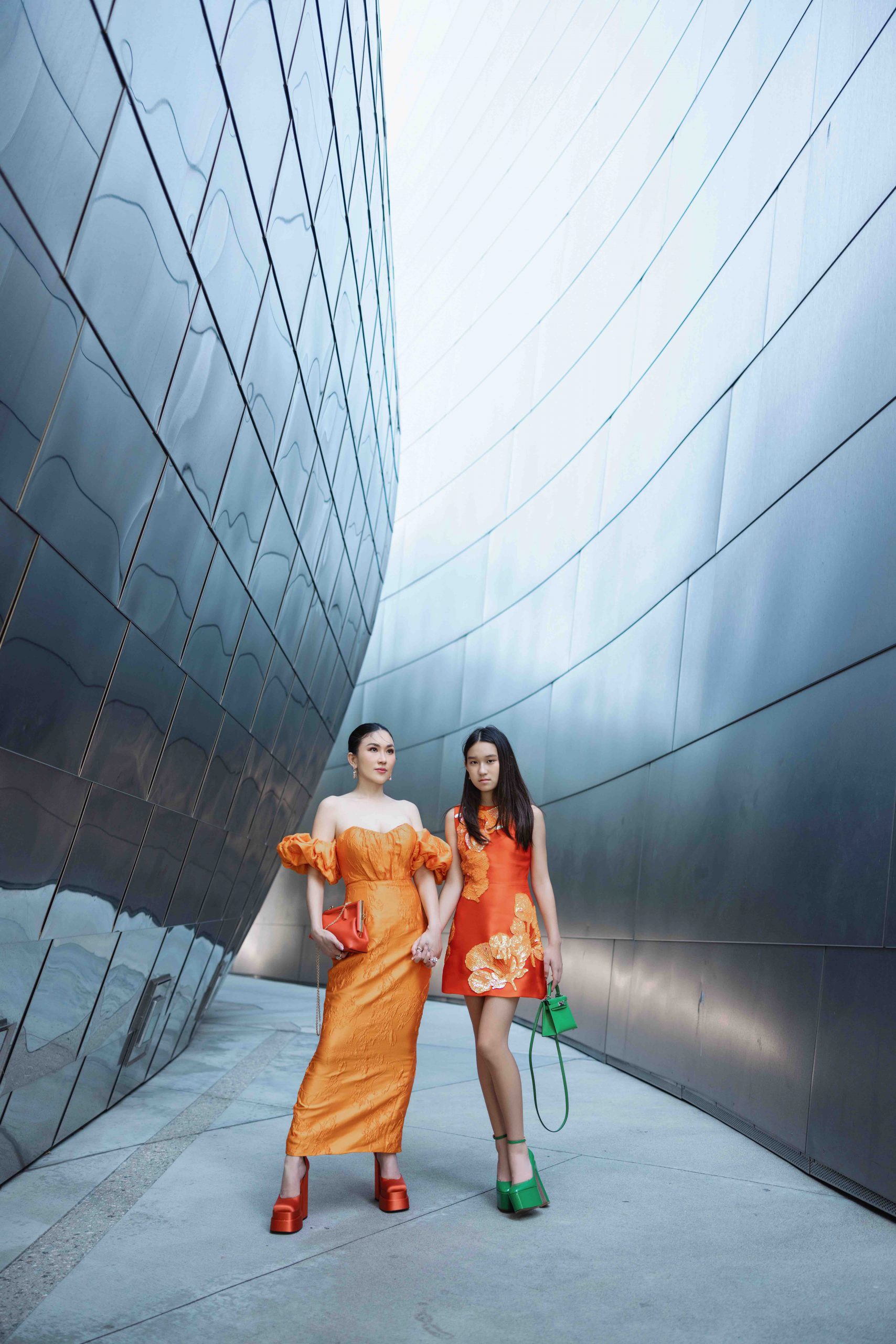 Sắc cam chủ đạo của BST lại được mix match khác biệt. Tông cam nhẹ trên chiếc đầm body off shoulder với điểm nhấn ở phần tay lồng đèn mang đến sự nhu mì, quyến rũ của người phụ nữ. Trong khi đó, mẫu đầm chữ A nhấn nhá hoạ tiết hoa phượng đính 3D lại được cô bé phối cùng platform heels xanh lạ mắt.